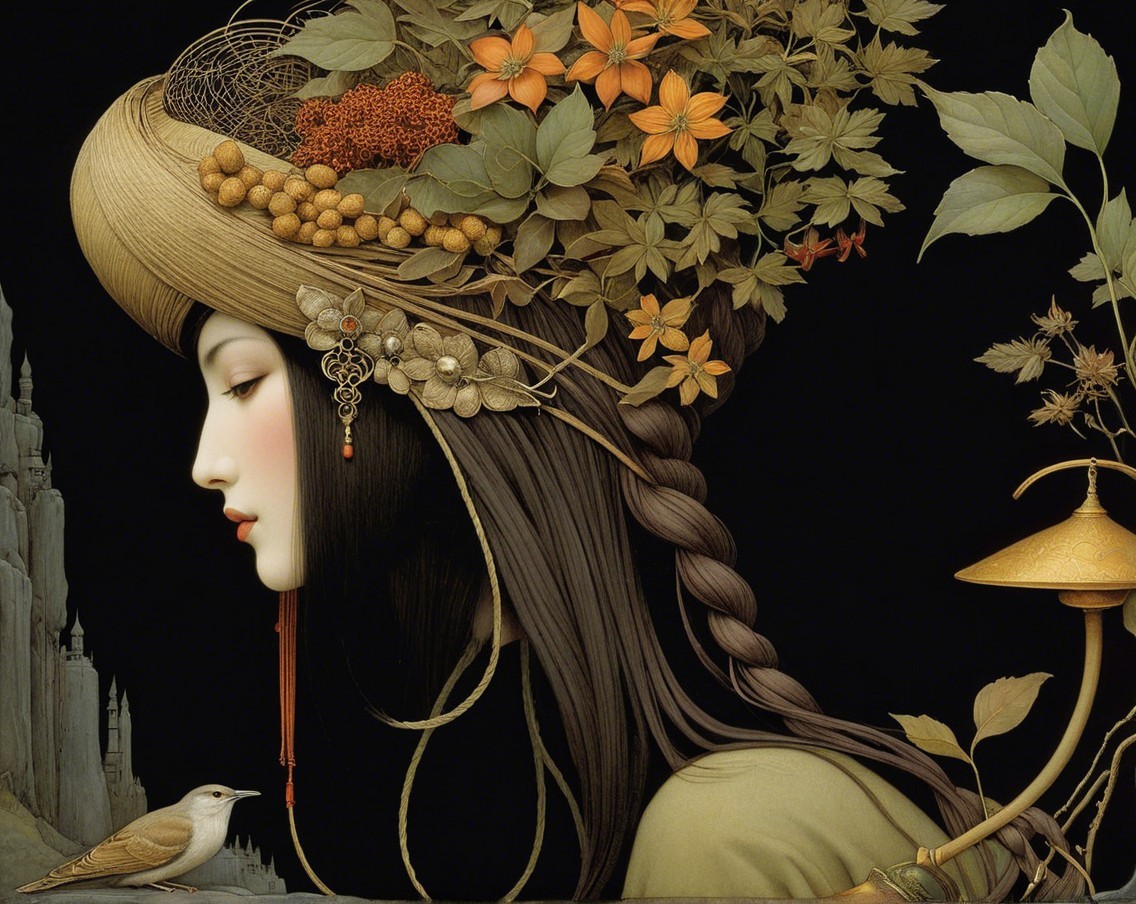 A graceful woman with long dark hair wears an elaborate ornate headdress. Her profile is highlighted against a dark background, adorned with floral elements, conveying beauty and elegance.