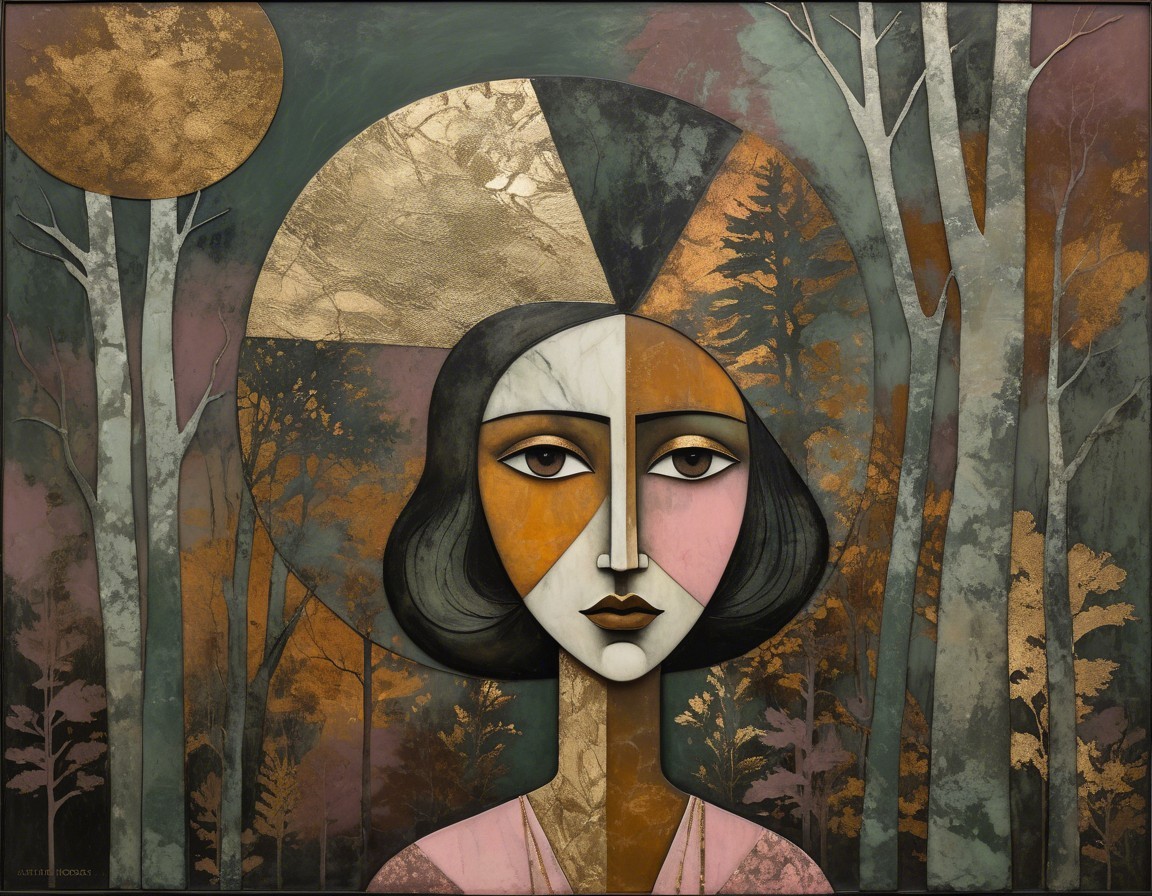 A stylized portrait of a woman with geometric features, set against a lush forest backdrop. Golden accents highlight her serene expression and the surrounding trees in a harmonious blend of colors.