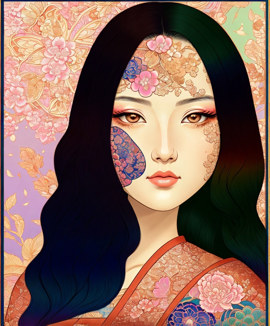Ukiyo-e style, beautiful female face, woodblock print, amber lighting 1.25, detailed ornamental hair, fantastic view, cinewash, brightness 1.4, inkpunk 1.8