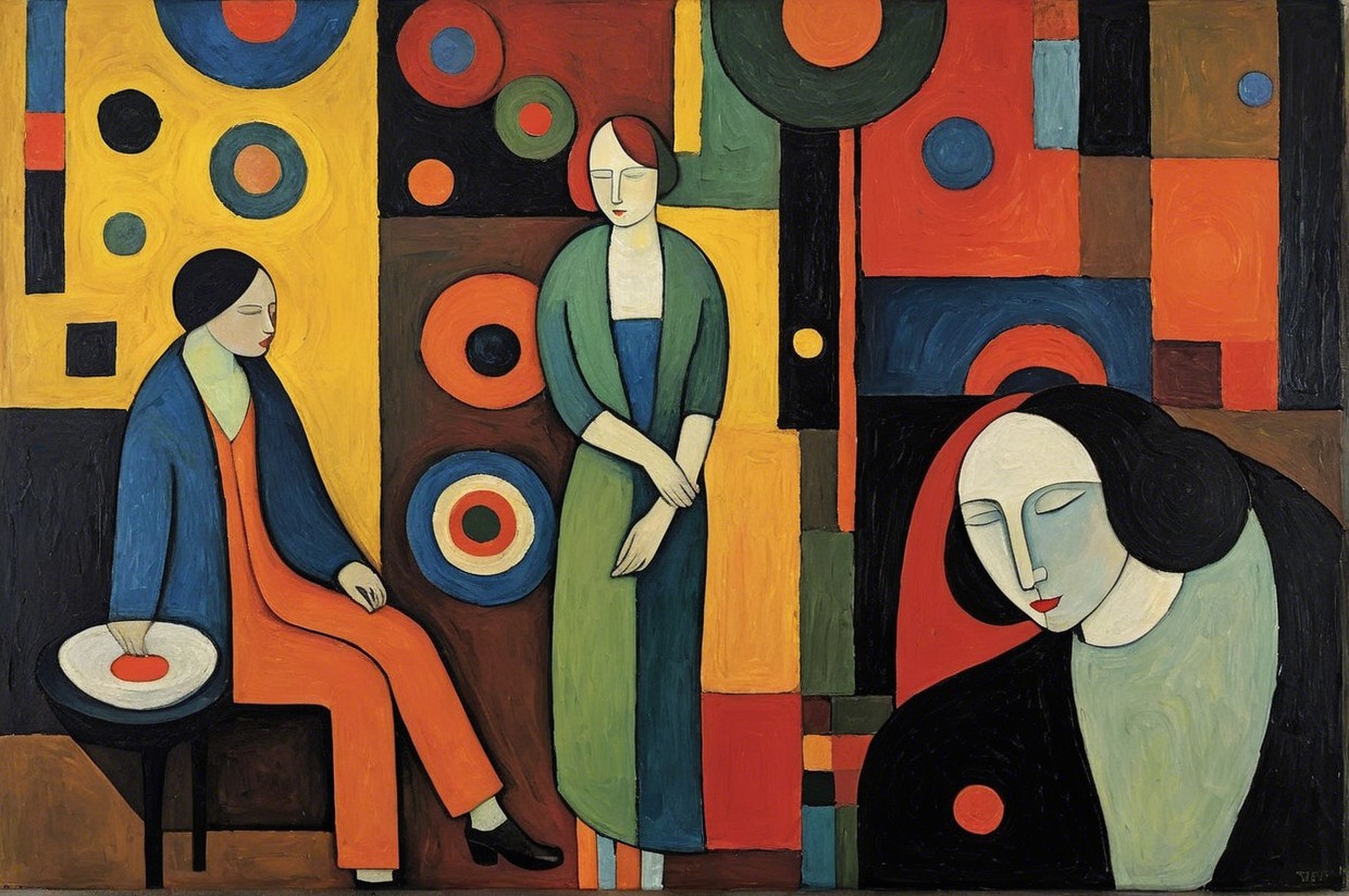 The painting features three stylized women against an abstract background of geometric shapes and bold colours, conveying a sense of emotion and modernist influence.