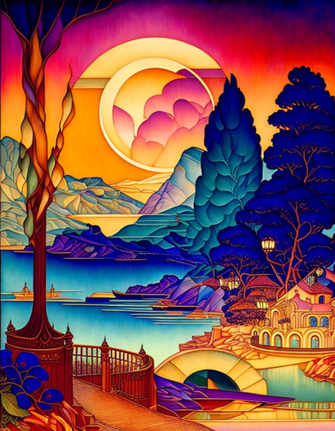 Art Nouveau Style Illustration of Woman with Golden Hair in Blue Dress