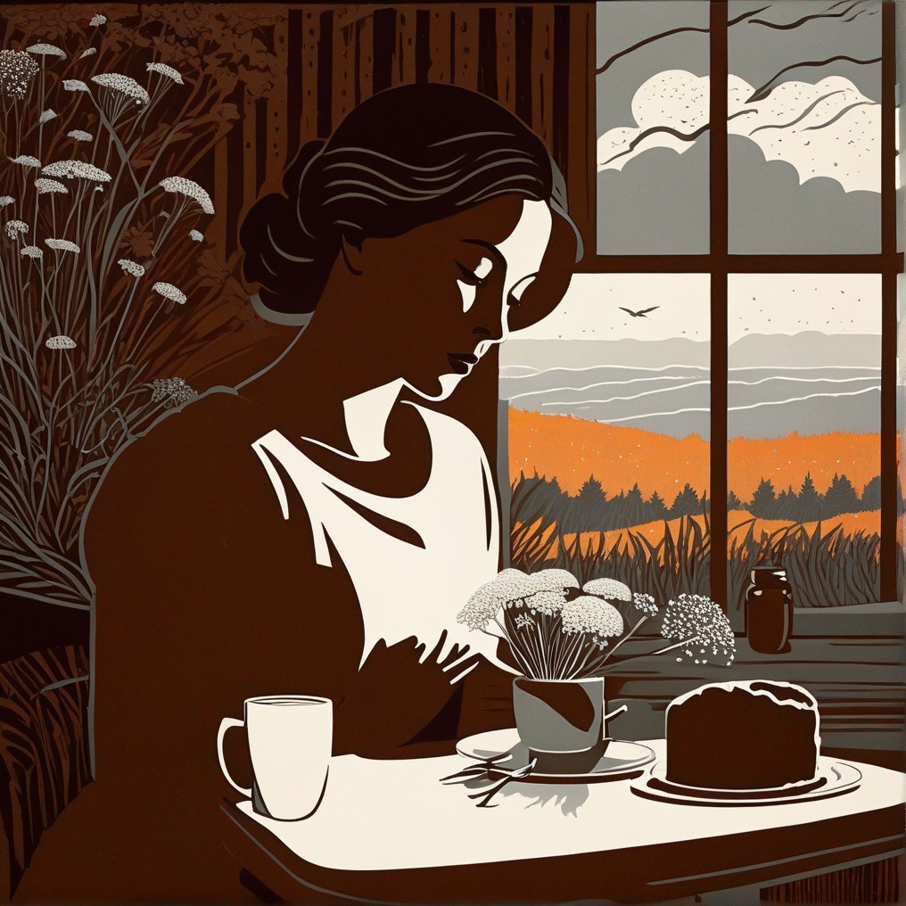 a vintage linocut, faded colors, Muted color, There is a birthday cake on the table , love of autumn a scene viewed in the Adirondacks in the morning . Intricate linocut art of queen anne's lace in the field, ominous storm clouds, pouring rain, and lightning in the distant sky at sunrise, in the style of david ligare, light gray and dark emerald, kay sage, raw figuration,, trompe l'oeil compositions, rusticcore , .. surreal, beautiful,