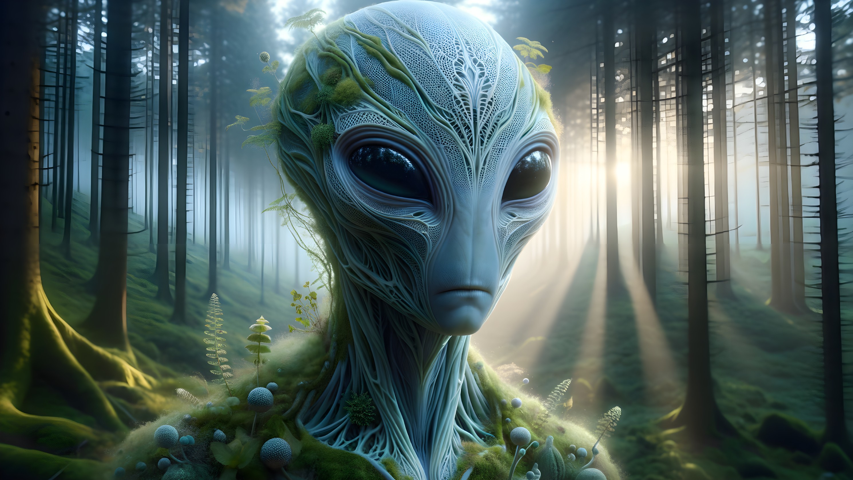 An ethereal alien being with a smooth, pale blue head adorned with lace-like patterns and large black eyes stands amidst a blurred forest. Its body, covered in vibrant moss and ferns, blends harmoniously with nature, exuding tranquility.