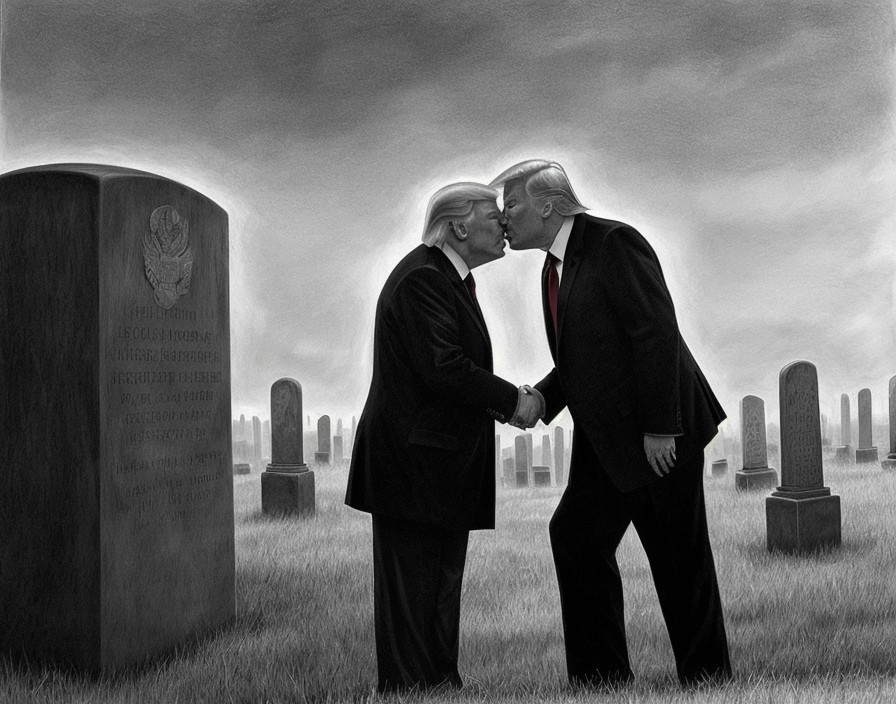 Men in suits shaking hands near "DEMOCRACY" gravestone among tombstones