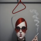 A striking figure with vibrant red hair and oversized red sunglasses. She wears a sleek black outfit and holds a cherry, exuding a bold and glamorous aesthetic against a muted background.