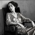A young woman in a flowing blue dress sits thoughtfully in an elegant chair. She gazes intently in a softly lit room adorned with a vase of flowers and a book on a nearby table.
