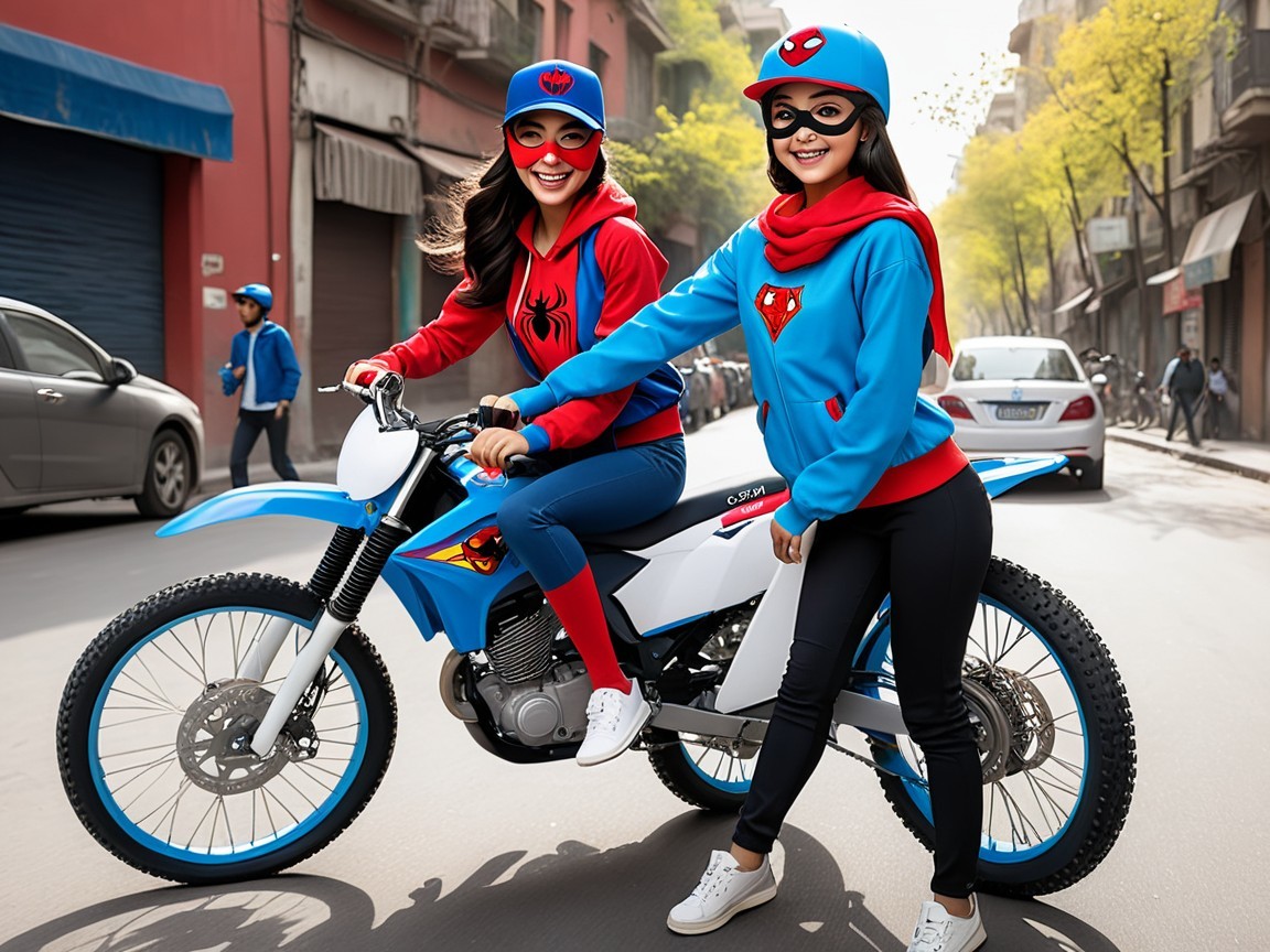 Draw a sketch of a man wearing a Spider-Man mask and a Columbia brand outfit, along with a beautiful Iranian girl wearing a Columbia brand hat and a Columbia brand outfit, riding a blue trail bike on the street among motorbikes and cars, looking happy and joyful.