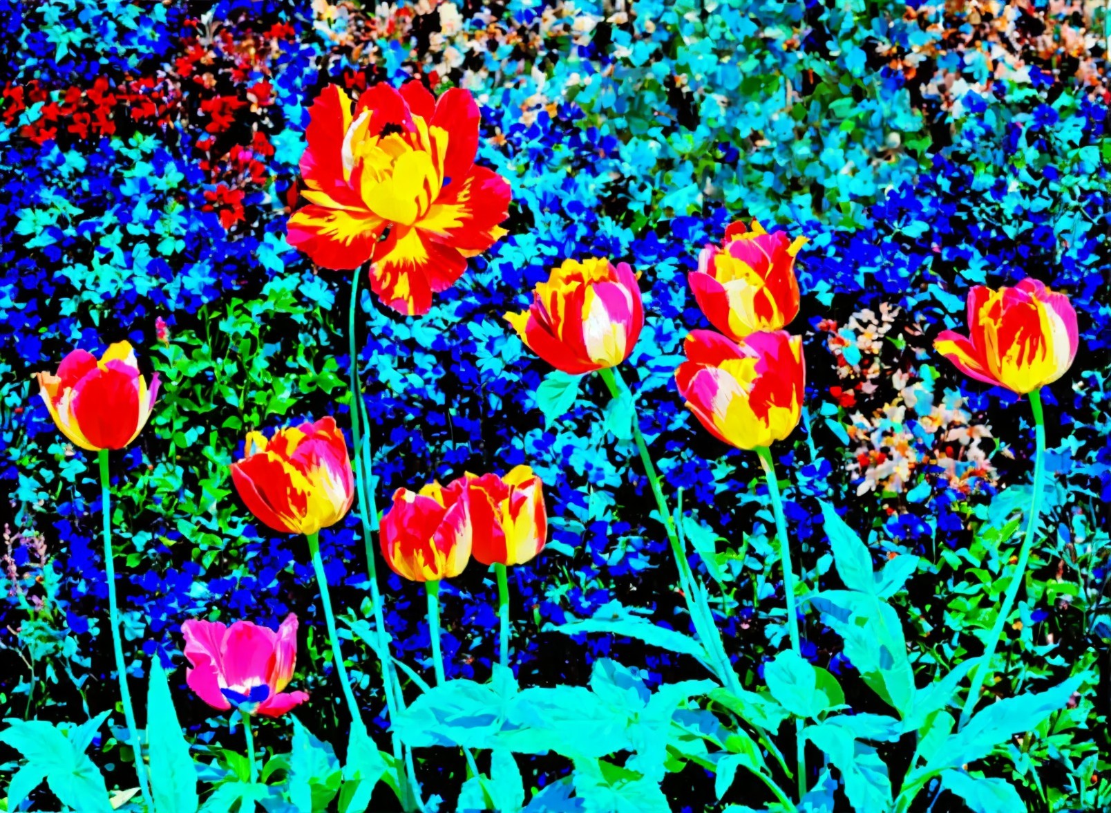 Vibrant garden with red and yellow tulips against a backdrop of blue and purple flowers.