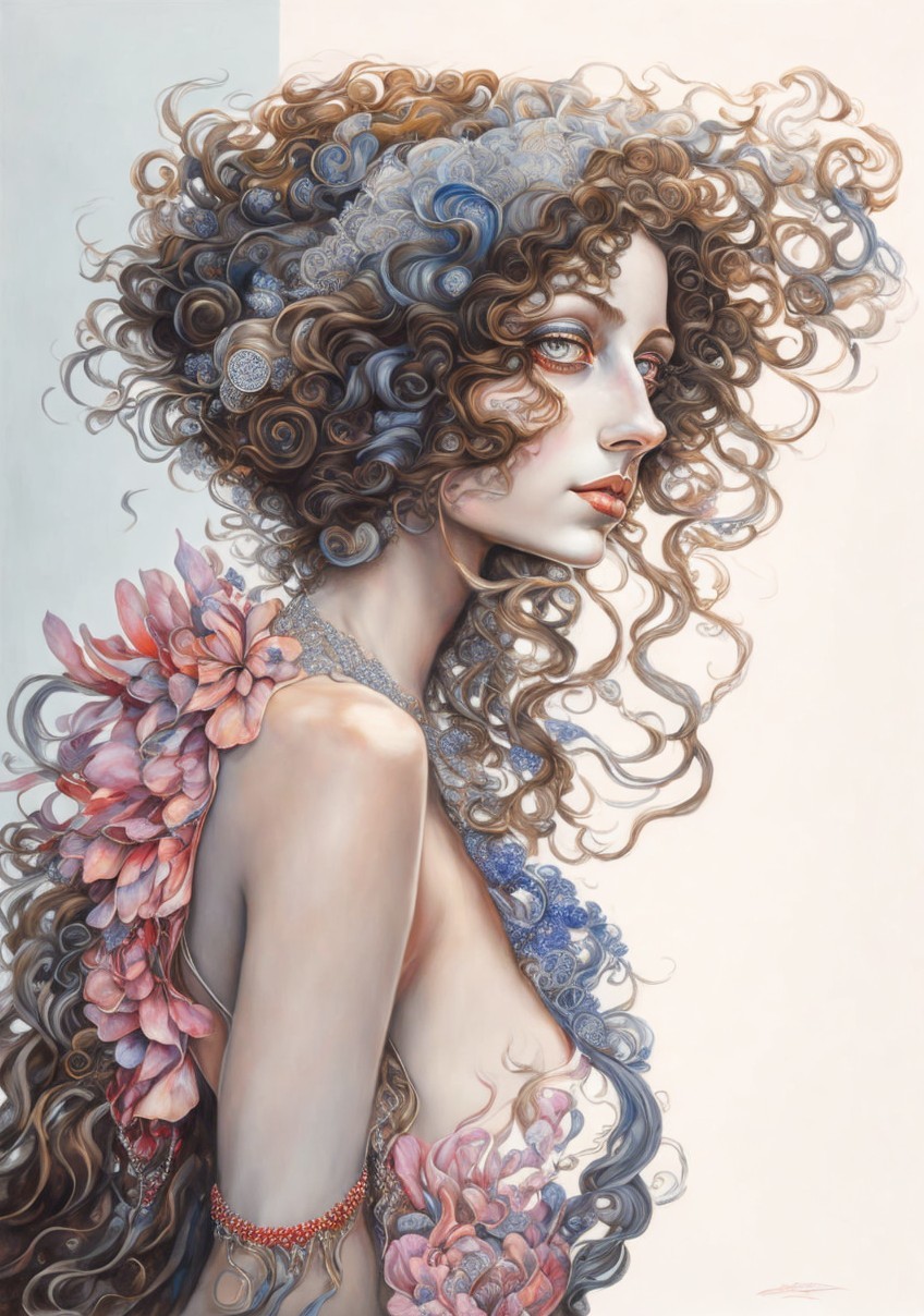 Gerald Scarfe and Ralph Steadman collaborated to create a stunning portrait of a captivating young woman with art deco influences. Her curly hair, a mix of brown and silver, cascades around her face, while her eyes mesmerize with shades of blue and grey. This masterpiece showcases the artistic brilliance of Scarfe and Steadman, capturing the beauty and allure of the subject with their unique styles.