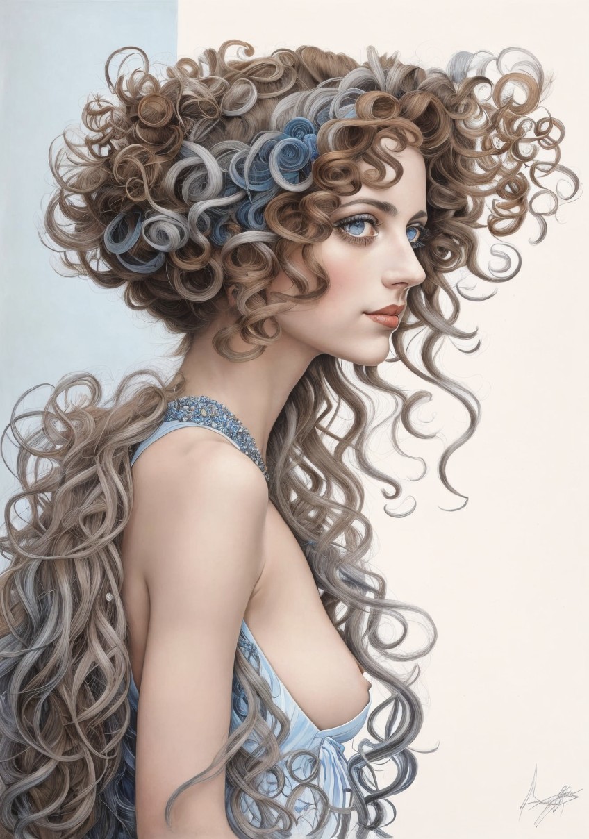 Prompt: Gerald Scarfe and Ralph Steadman collaborated to create a stunning portrait of a captivating young woman with art deco influences. Her curly hair, a mix of brown and silver, cascades around her face, while her eyes mesmerize with shades of blue and grey. This masterpiece showcases the artistic brilliance of Scarfe and Steadman, capturing the beauty and allure of the subject with their unique styles.