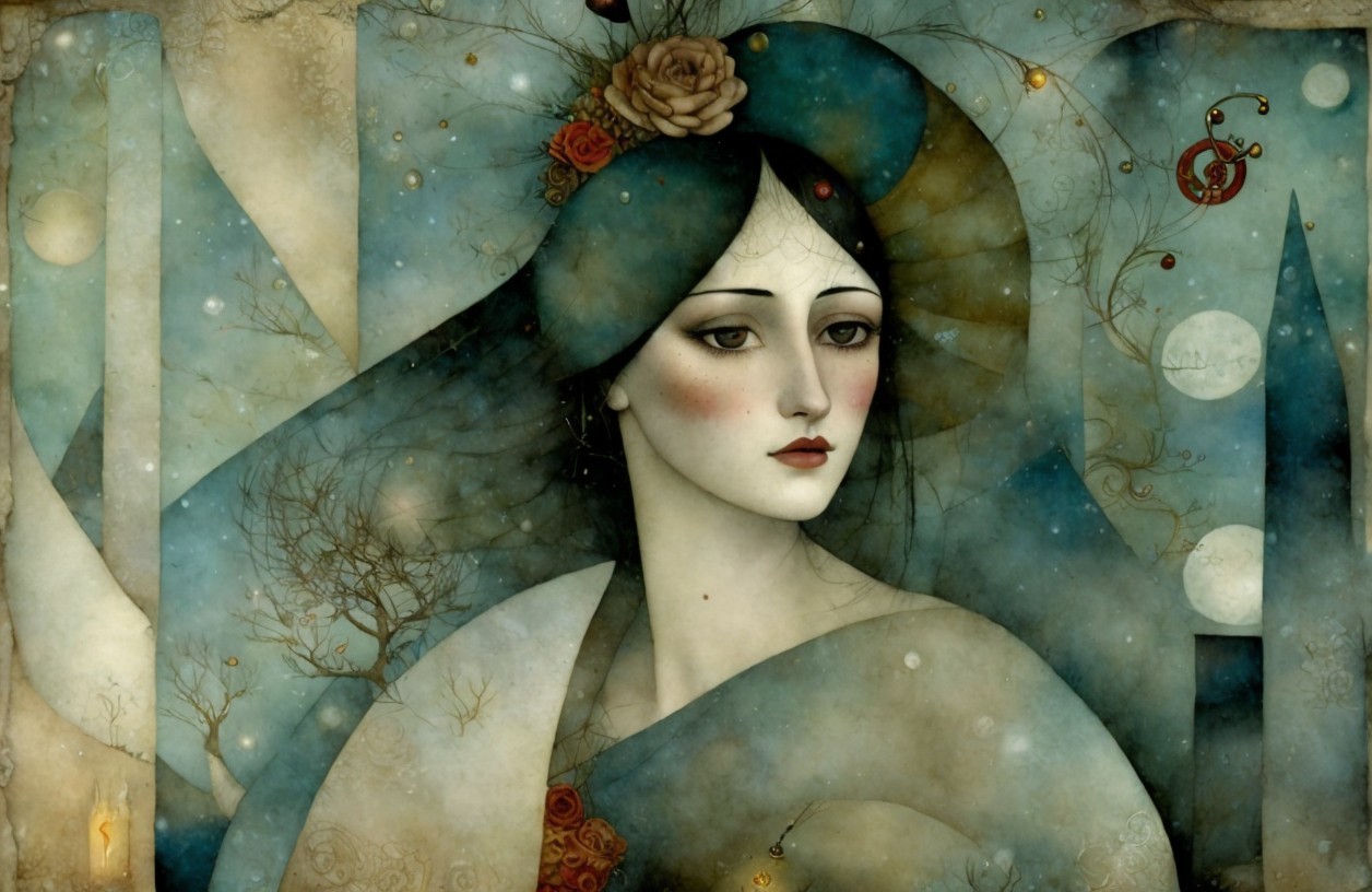 Illustrated By Kit Williams, Jamie Heiden, Daniel Merriam, Paul Klee, Karol Bak, Salvador Dali, extremely detailed, high definition, crisp quality, ultra detailed background Parisian Christmas enchantress.