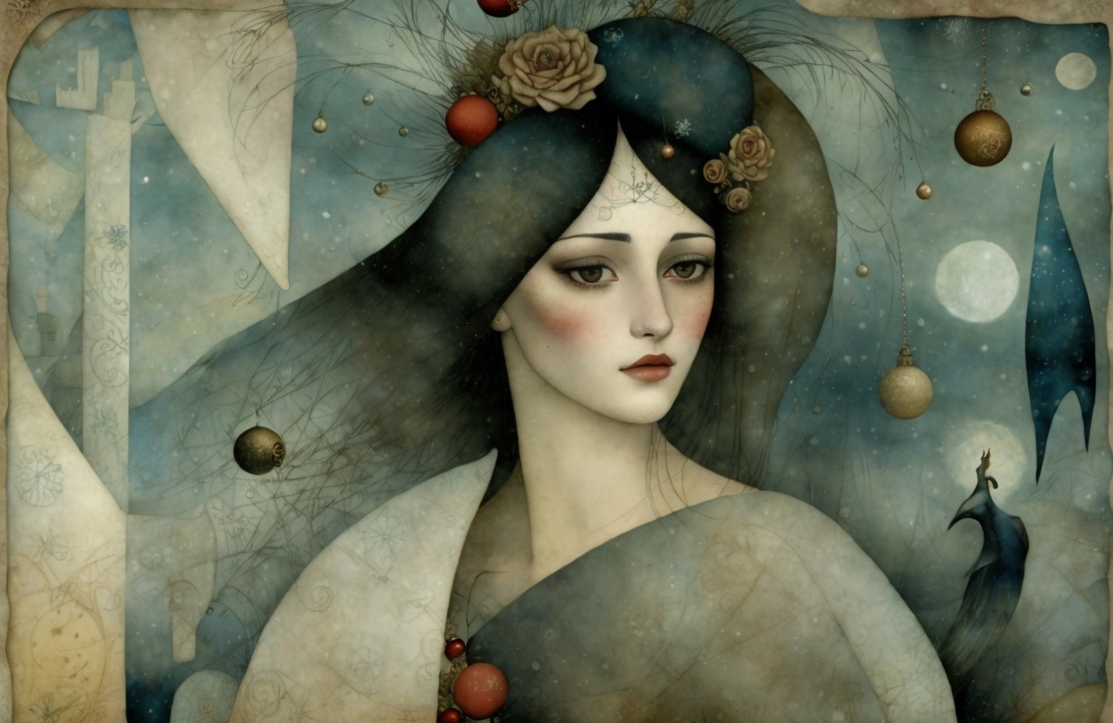 Prompt: Illustrated By Kit Williams, Jamie Heiden, Daniel Merriam, Paul Klee, Karol Bak, Salvador Dali, extremely detailed, high definition, crisp quality, ultra detailed background Parisian Christmas enchantress.