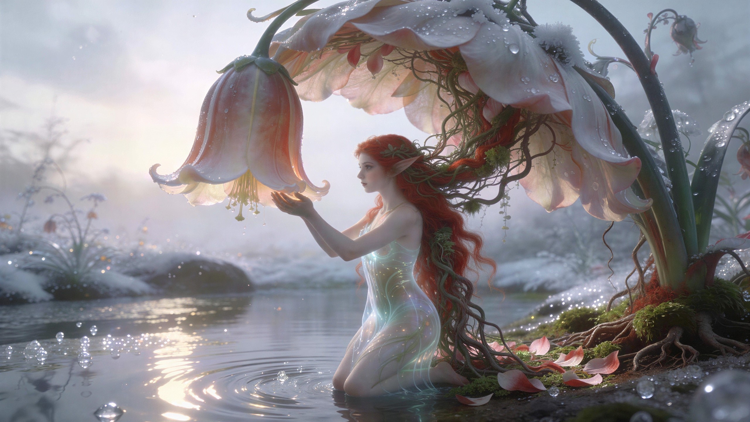 A full-shot image of a beautiful elf woman with long, flowing red hair with green plants and roots intertwined in it, wearing a sheer, iridescent, light blue dress, kneeling in a shallow body of water at dusk, her hands cupped as if catching falling droplets, with a large, de
