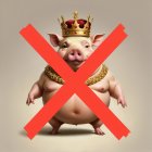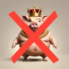 Hand-painted X over anthropomorphic fat slovenly, greedy, frowning evil cartoon pig on hind legs wearing a gold crown against a neutral background
