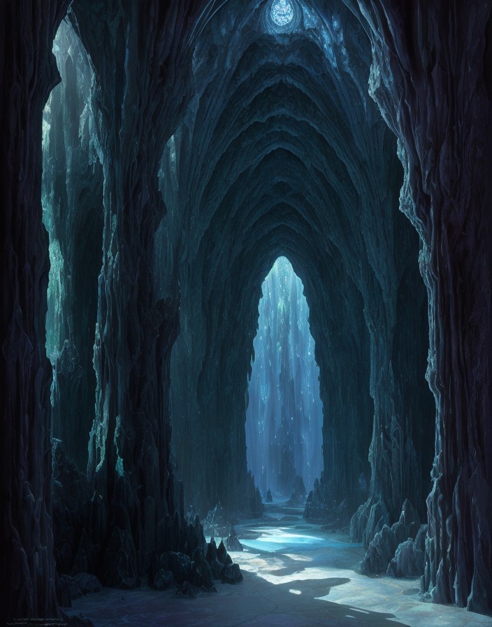 Prompt: "corner view passage to glorious fantasy kingdom hidden in dark eldritch asymmetric glass and mirrors stone cave fantasy-dwarves sanctuary, mists, ghosts, scary shadows, witchcraft symbols and bas-reliefs carved at marble; surrealistic oil on canvas by Vladimir Kush, Antoni Gaudi, surrealism detailed volumetric lighting, soft colors gamma, light ray"