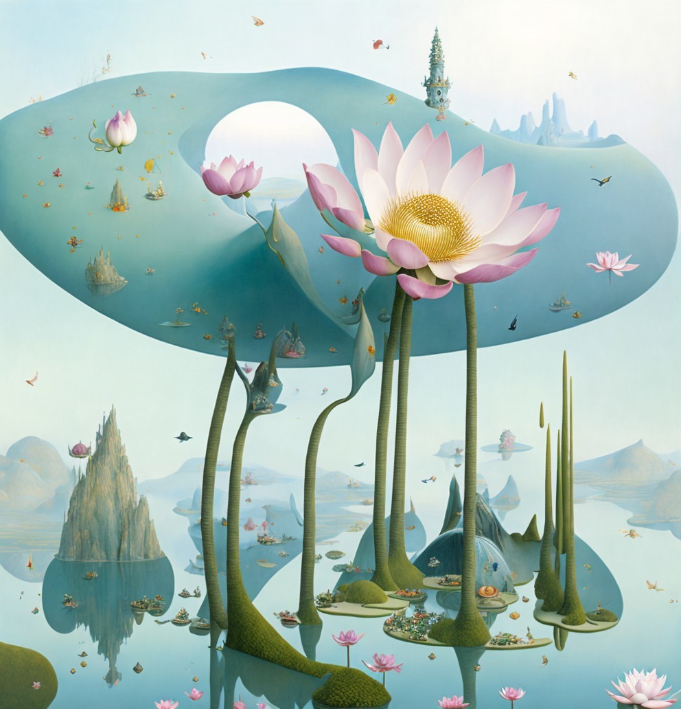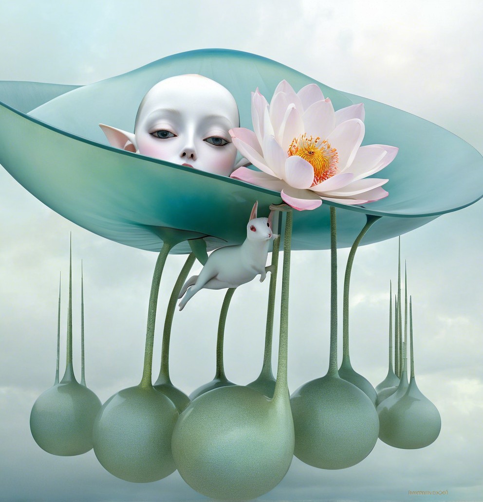 The image features two serene figures resembling Buddhas sitting amidst fantastical, colorful tree-like shapes, adorned with gold accents and mystical elements, creating a tranquil spiritual atmosphere.