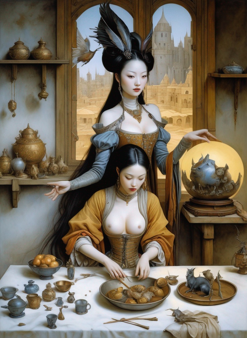 A woman in historical attire sits at a table with ornate objects, a bird perches nearby, all set against a fantasy palace backdrop.