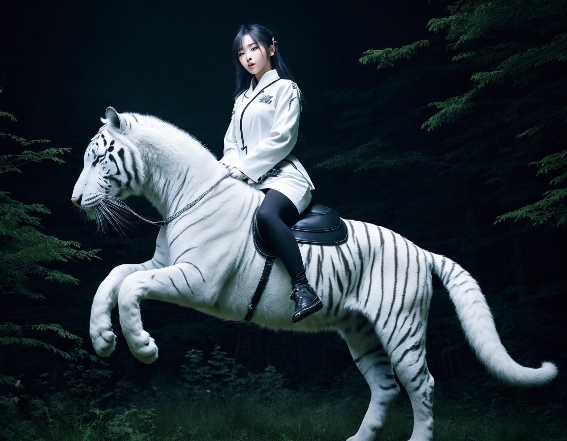 A gorgeous Korean K-Pop star riding on top of a beautiful white tiger in the middle of an ethereal forest at midnight.