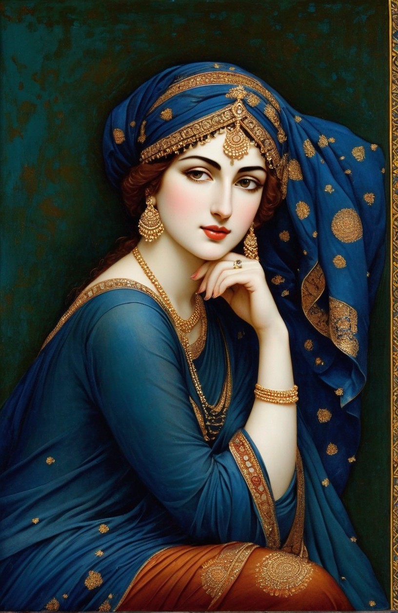 fashionable young woman - 3rd century Persian miniature art . dark sky-blue and dark gold, energy-filled illustrations, delicate pointillism, bold stencil, celestial, screen printing, organic (Padmanabha., whimsical, beautiful, poignant, touching. colors rose, gold, rust, burgundy, black.soft watercolor extra water in Art Deco by Annigoni, Egon Schiele, Milo Manara, Botticelli, Catrin Welz-Stein, Jean Metzinger, Klimt, perfect eyes, perfect handsface, highly detailed, complementary colors, hyper detailed. Watercolor and ink splatter, dynamic pose, dark blue background, unreal engine, greg rutkowski, loish, rhads, beeple, makoto shinkai and lois van baarle, ilya kuvshinov, rossdraws, tom bagshaw, alphonse mucha, global illumination, detailed and intricate environment