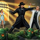 A masked hero confronts a villain in a dramatic scene, while a woman in a blue dress looks on. Shadows and light create tension, and masked figures lie defeated in the background.