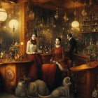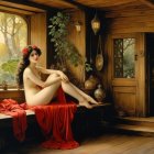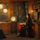 Two elegantly dressed women sit peacefully in a serene forest setting. A tiger and a fox rest nearby, adding a touch of wildlife to the tranquil atmosphere. Sunlight filters through the trees.