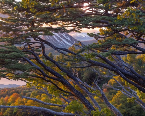 A serene landscape featuring twisted trees framing a picturesque view. Vibrant autumn foliage contrasts against distant mountains, illuminated by warm, soft light.