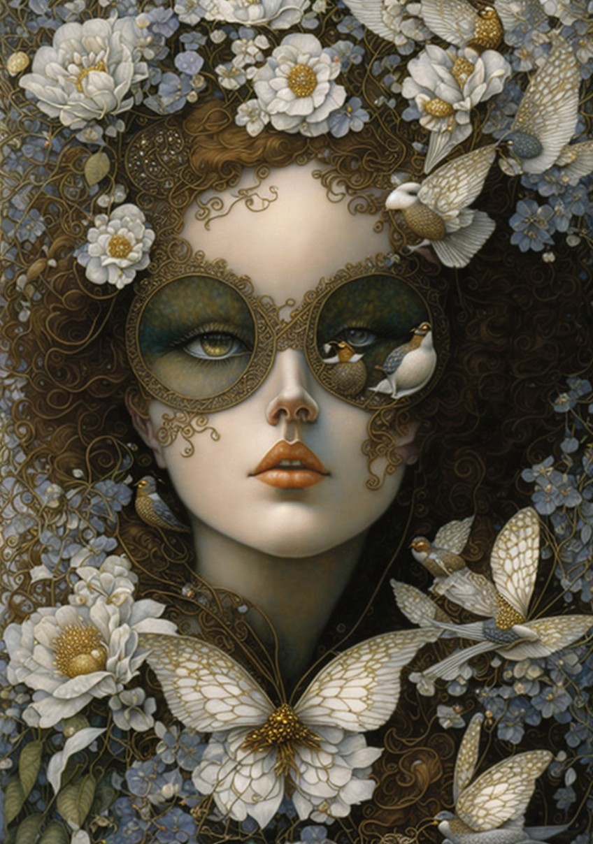 A serene portrait of a woman adorned with flowers and butterflies, wearing ornate goggles. Her flowing hair blends with the floral elements, creating an ethereal and dreamlike atmosphere.