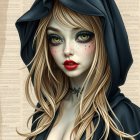 A striking portrait of a woman with long blonde hair, wearing a black hoodie. Her intense green eyes and bold red lips create a captivating contrast, enhanced by a delicate choker necklace.