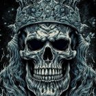A regal skeleton adorned in ornate golden armor and a jeweled crown, illuminated by mystical blue light, exudes an eerie majesty, embodying a powerful and haunting presence.