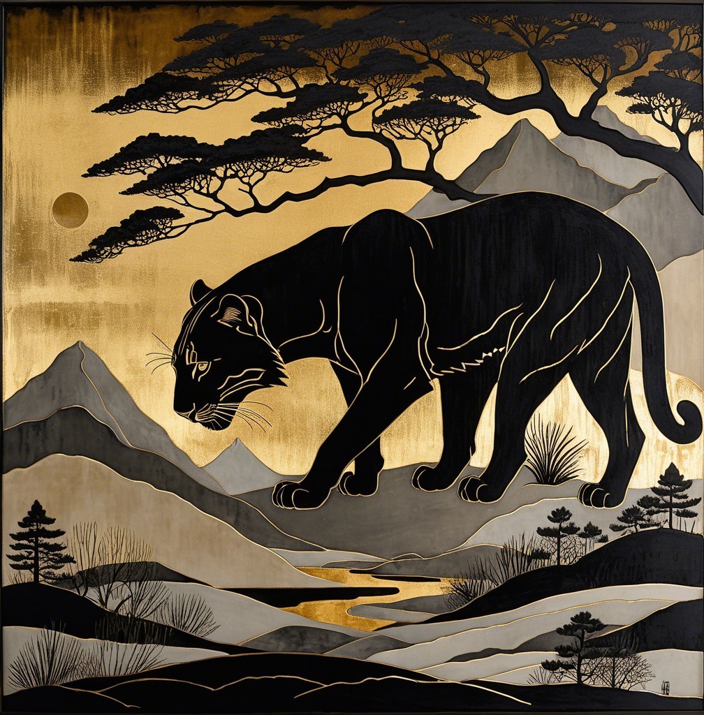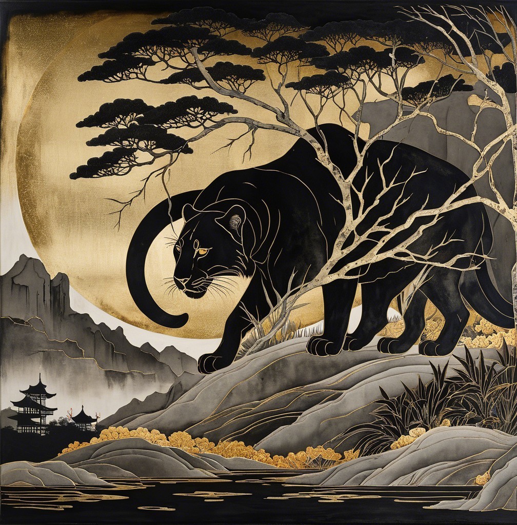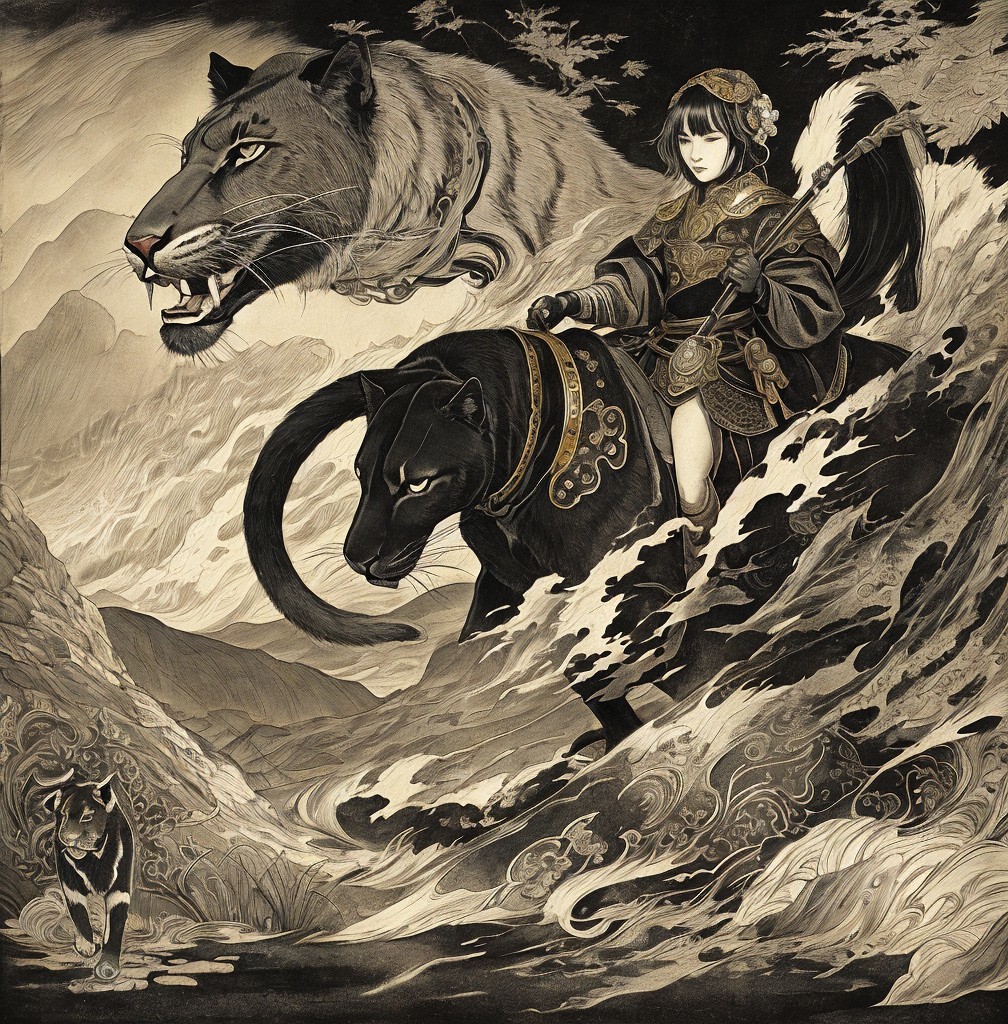 Legend of the Girl and the panther , Medieval Japanese Artists Sumi-e Style, Velvet Black, Shabby, Dull Gold, Amber Gray, . dramatic