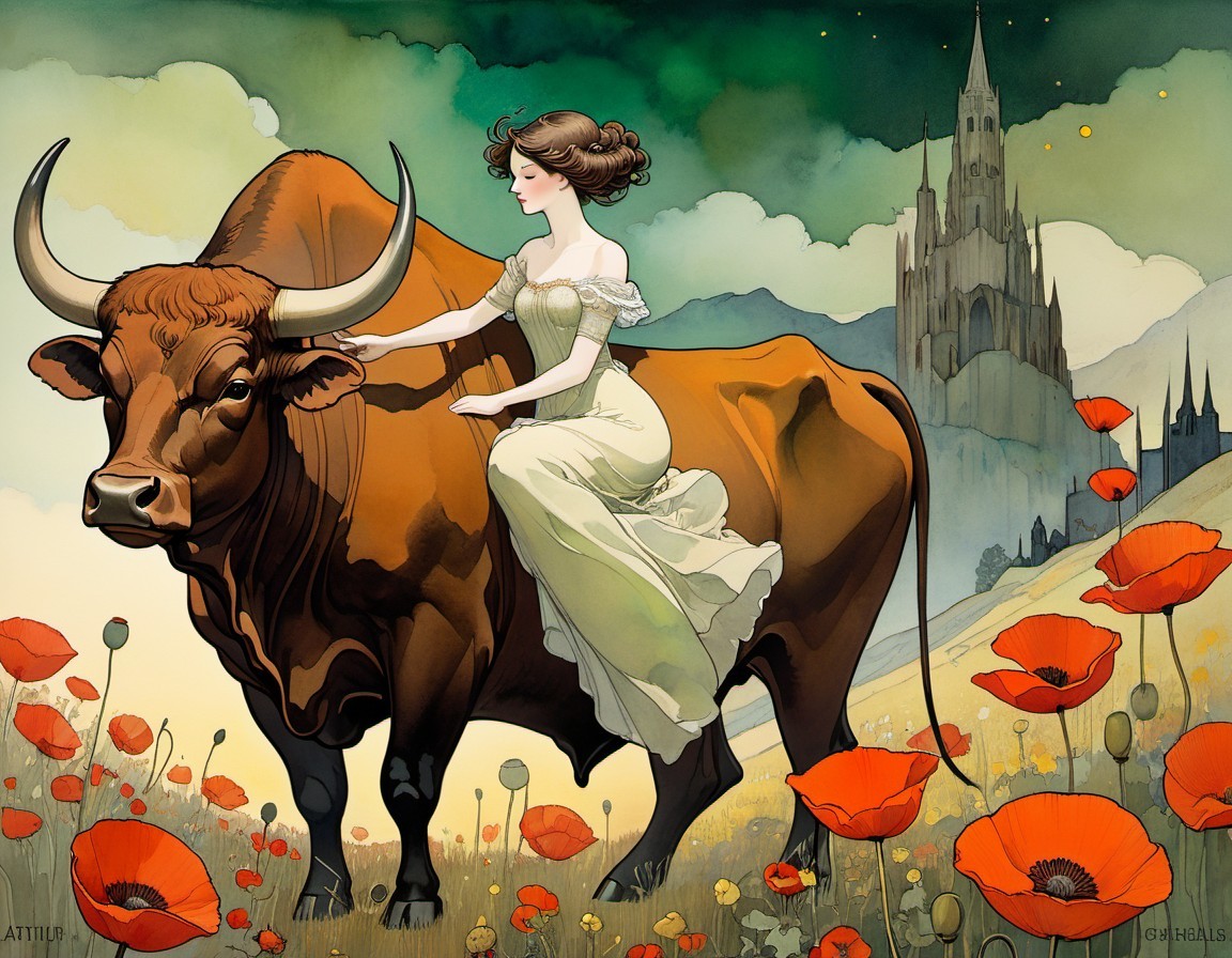 Single image. Art nouveau. The quantum nature of things. A beautiful woman and a large Bull. poppies. colors: mimosa, olive, mustard, chocolate dark green, metallic copper, metallic bronze.