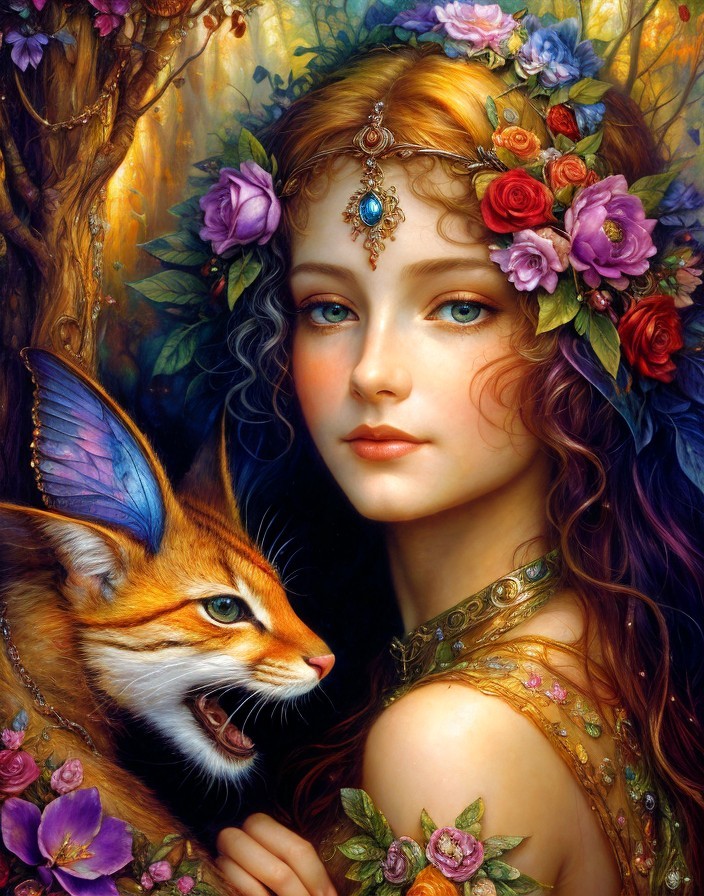 Fantastical portrait of woman with floral crown and fox with butterfly wings