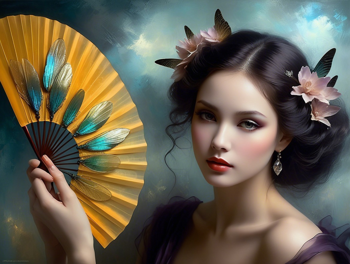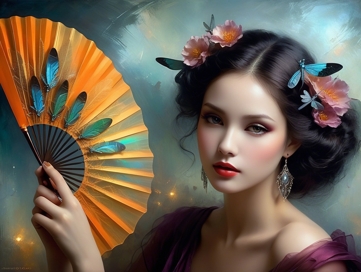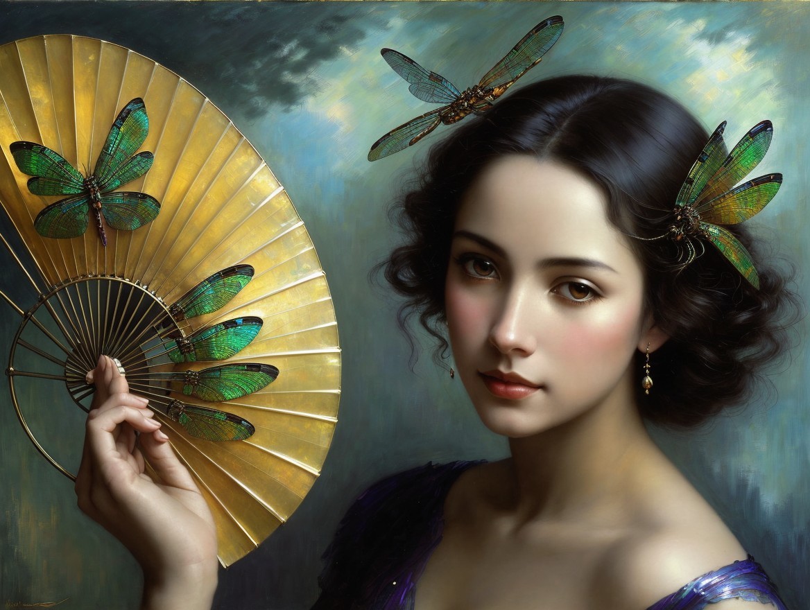 A woman with elegant features holds a golden fan, adorned with a delicate dragonfly in her hair. The soft, ethereal background enhances her serene beauty and graceful poise.