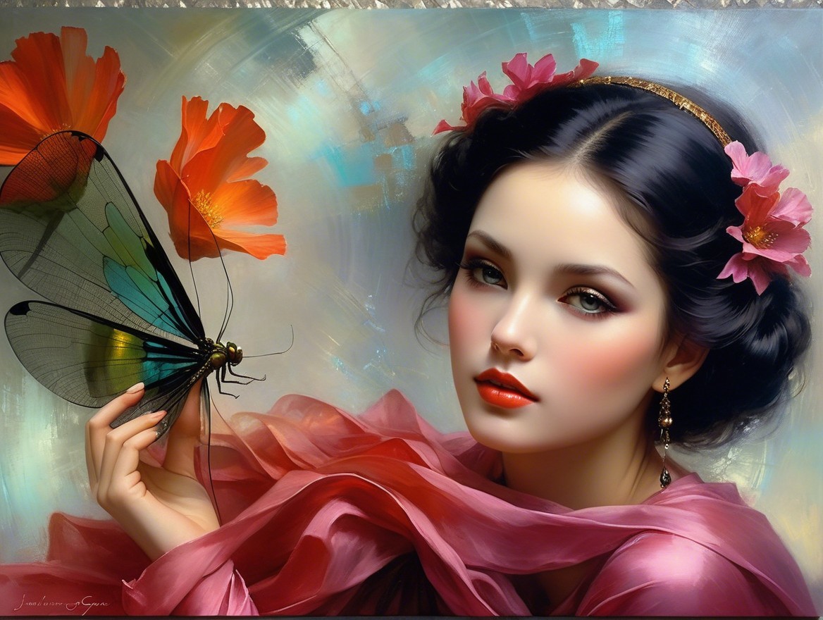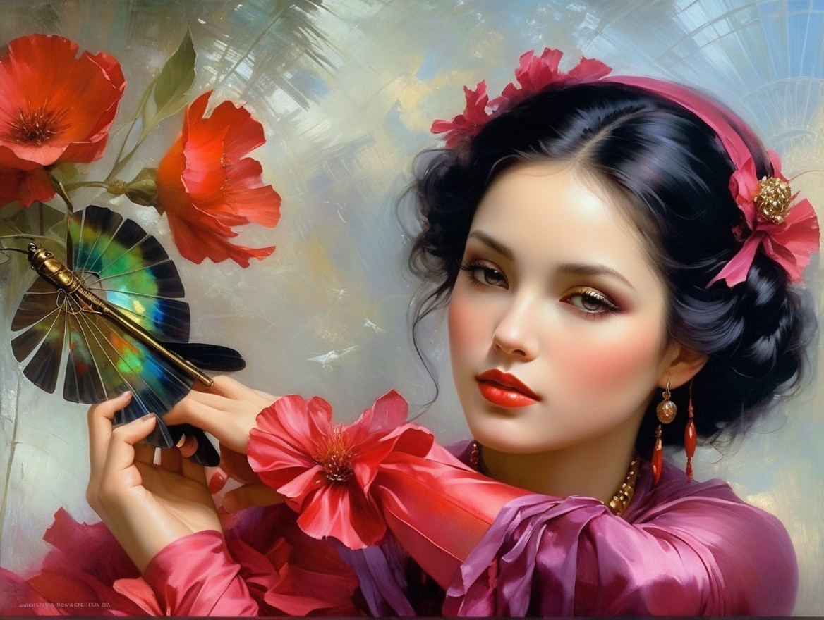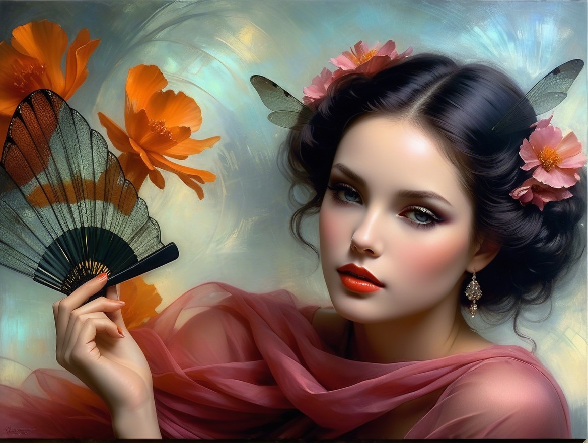 beautiful woman holding a fan made from dragonfly wings. Mysterious woman Surreal dream in the style of pino daeni. Magical nostalgia, glory, Mercury Glass patina, light and gossamer haze, topographic lines, Art Brut, moody, somber, desaturated colors. In the style of John Rogers cox . This artwork amalgamates the artistic styles of Michael Parkes,