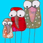 Three whimsical, colorful creatures with round bodies and long legs stand against a bright blue sky dotted with clouds. Their playful designs feature polka dots and cheerful expressions.