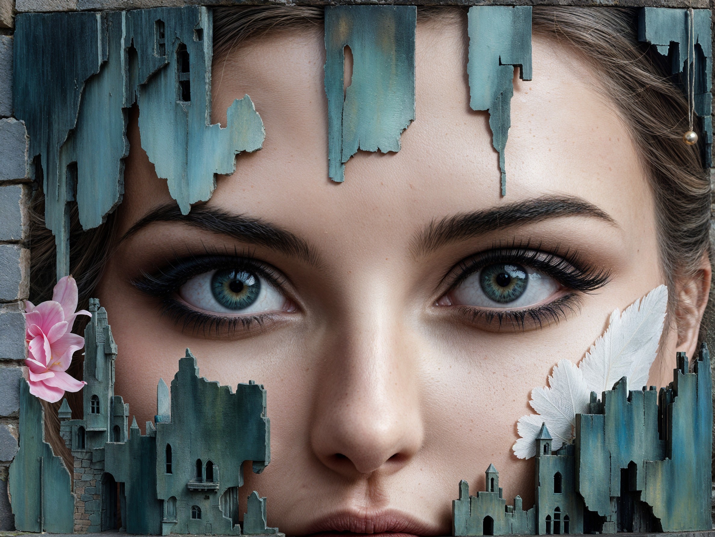 A fantastical portrait blends a woman's striking eyes with dreamy castle imagery. Surrounded by surreal landscapes, it captures a whimsical vision of imagination and beauty.