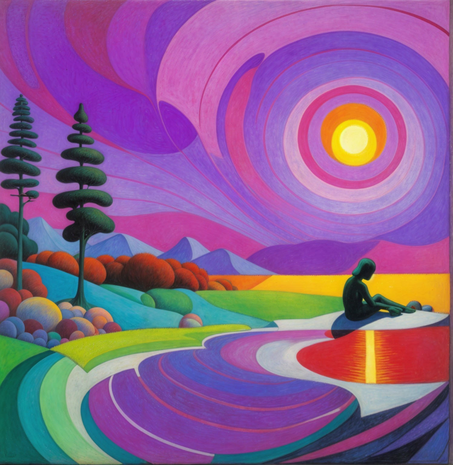 A vibrant abstract landscape features swirling purple and pink skies above a serene setting. A solitary figure sits by a reflective body of water, surrounded by stylized trees and rolling hills.