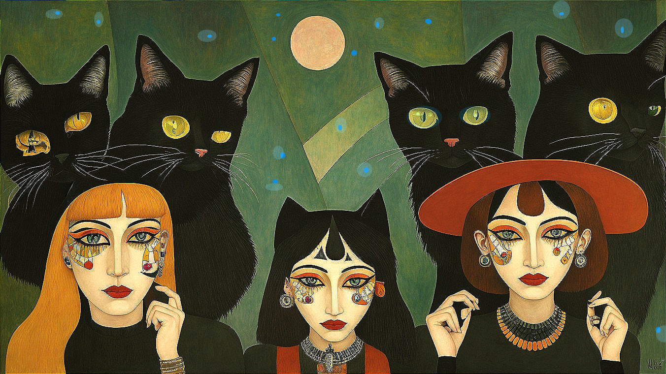 The artwork features three stylized women adorned with intricate jewelry and bold makeup, flanked by large, watchful black cats against a vibrant green background. Sun and moon motifs accent the scene.