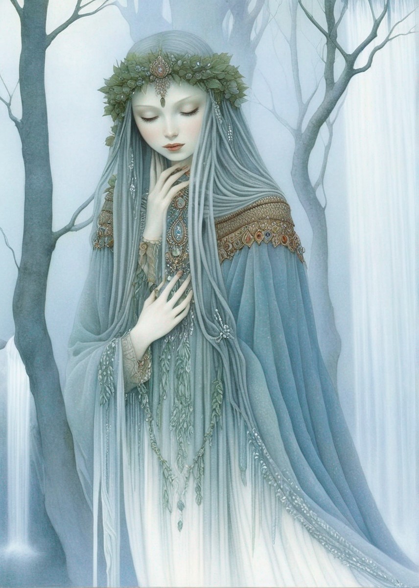 Woman with leafy headwear embracing rock near waterfall in serene illustration