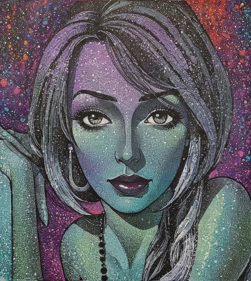 The artwork features a striking female face with vibrant shades of blue and purple, set against a cosmic background filled with colorful splatters, evoking a dreamy, ethereal quality.