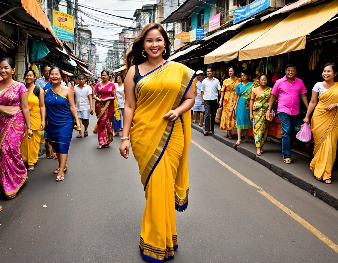 A confident woman in a yellow saree leads a vibrant group of people in colorful attire down a bustling street, surrounded by shops and lively market scenes. Sunshine brightens the atmosphere.