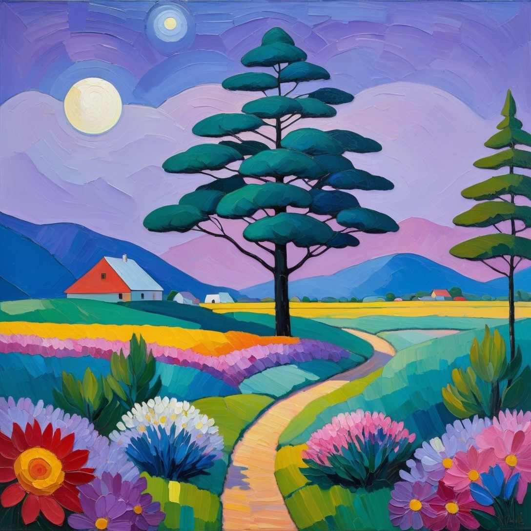 A vibrant landscape features a lush tree at the center, surrounded by colorful flowers and rolling hills under a blue sky with two shining moons. The scene radiates joy and tranquility.
