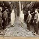 A vintage photo featuring a group of six men in formal attire, standing in a wooded area. Among them is a figure in a ghostly white sheet with lace trim, creating a whimsical effect.