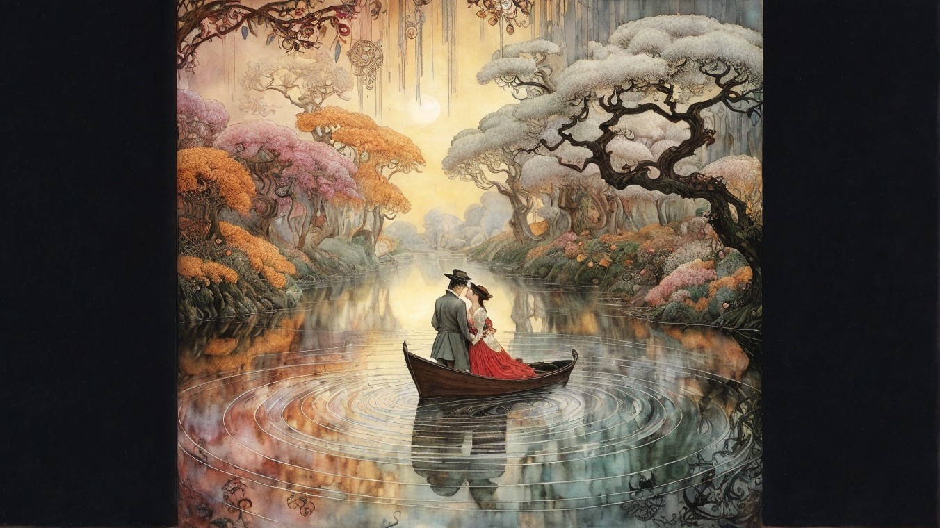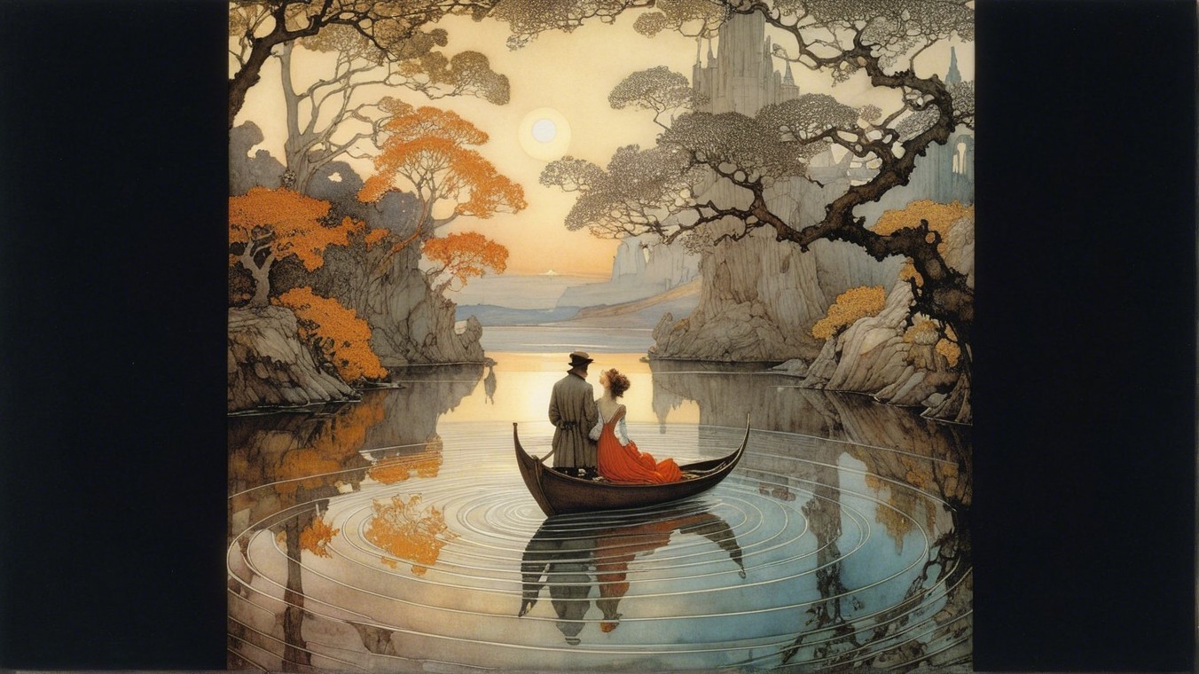 A serene scene of a couple in a small boat on calm waters, surrounded by rocky cliffs and vibrant trees. The sunset casts a warm glow, creating a romantic and tranquil atmosphere.