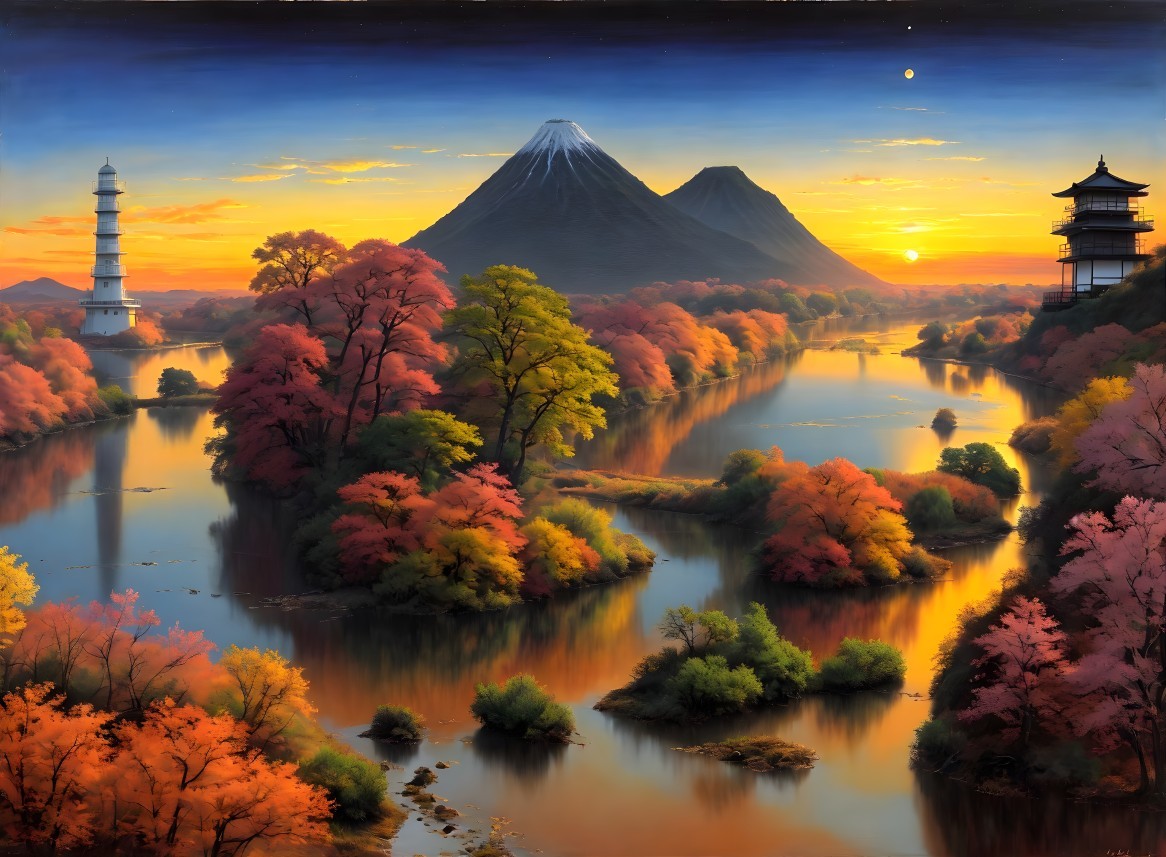 Prompt: Surrealist plot. Oil on canvas, wide angle landscape view, a surrealist wonderful spring sunrise over a river at Japan. Glowing with vibrant hues, glowing with vibrant hues, sky transitioning from warm orange to deep purple. Perfect composition. By William Turner. By Giorgio de Chirico. By Jos de Mey,