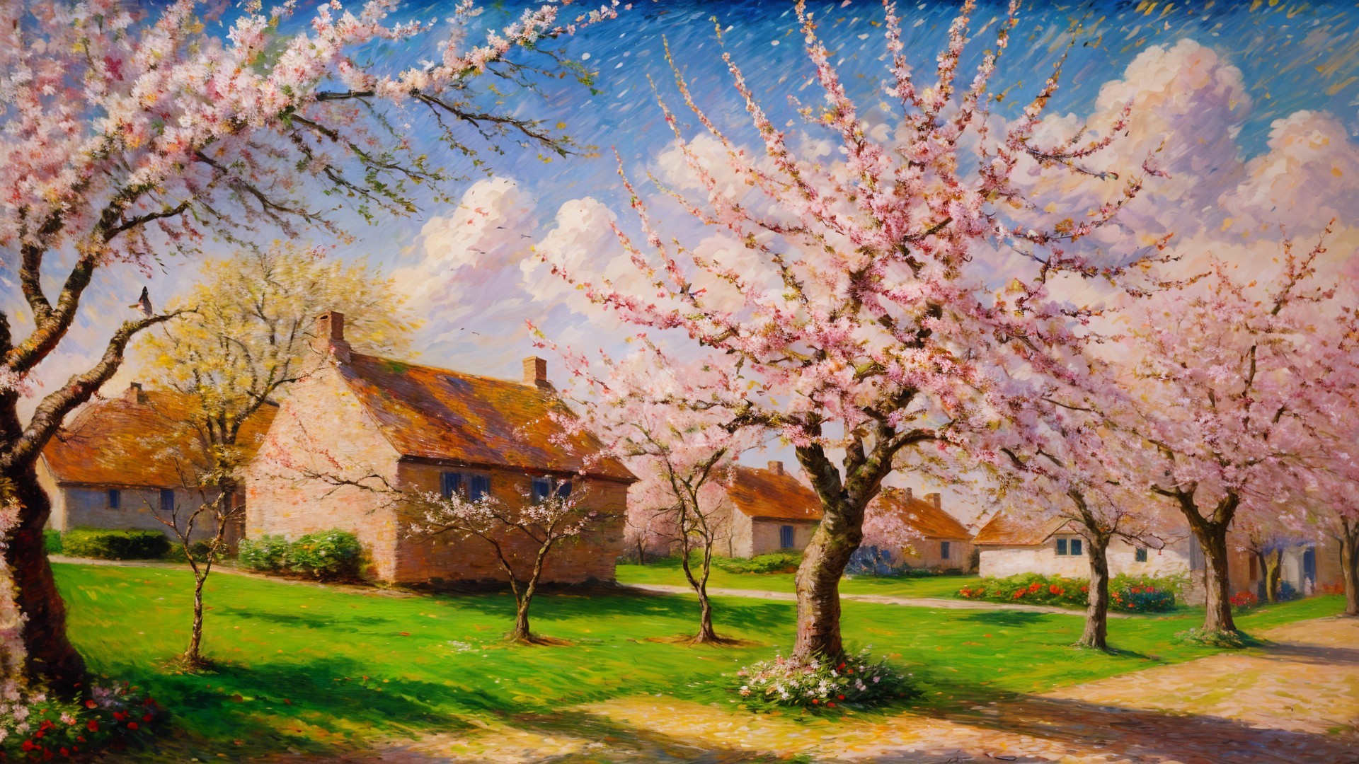 A picturesque landscape features quaint houses surrounded by vibrant cherry blossom trees. The sky is filled with fluffy clouds, creating a serene and colorful spring scene. Note: This comes to mind because the other day I went out in the morning and there were two or three cherry trees in blossom. By the end of the day there was a mist of green sprouts on the trees with only a few still leafless from the winter. It is remarkable that here in Michigan the season changes in a day.