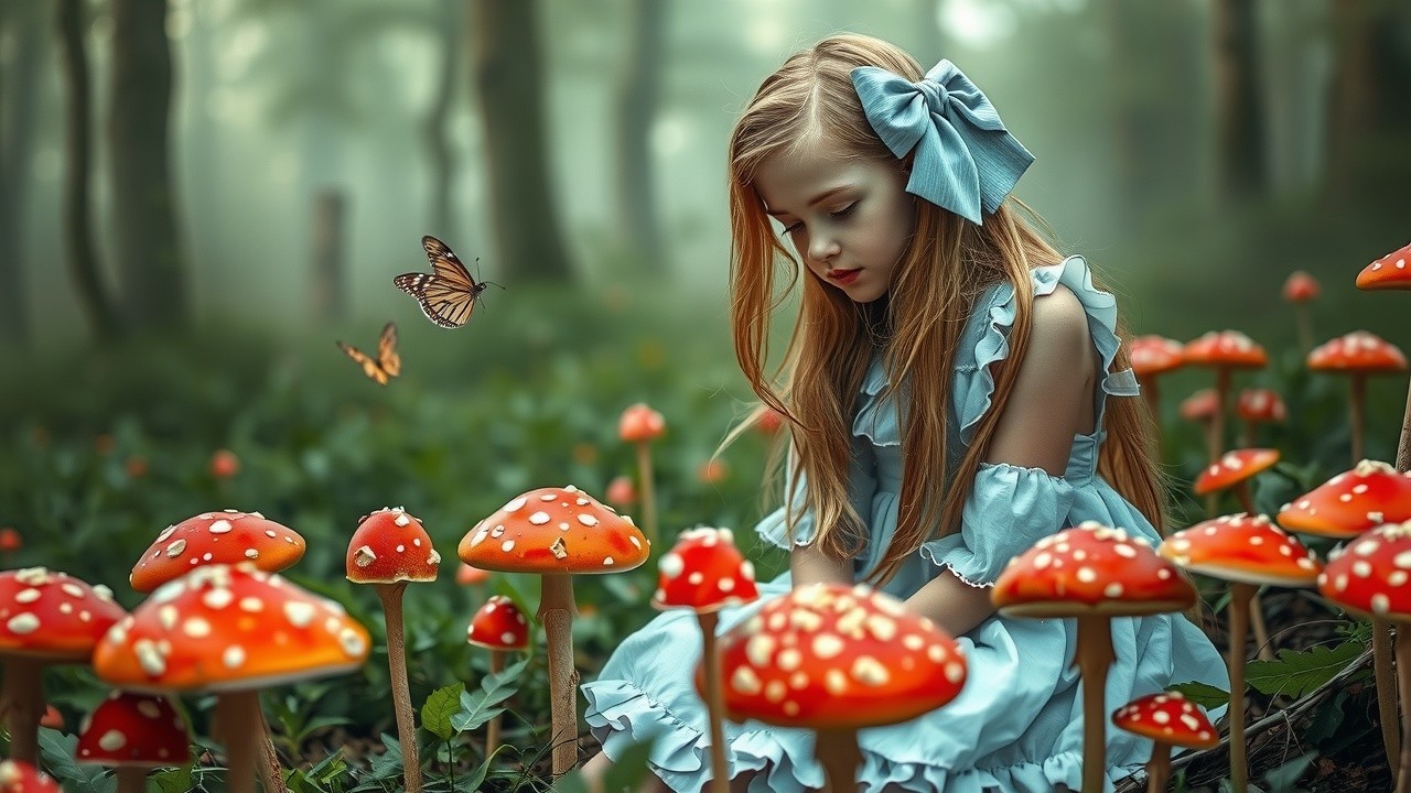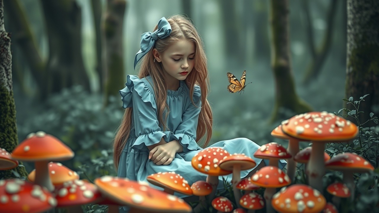 A young woman with long blonde hair sits on the forest floor, surrounded by vibrant red toadstools. Dressed in a light blue frilled gown and a blue bow, she gazes thoughtfully amid a misty, enchanting backdrop.
