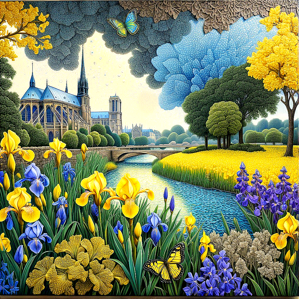 A vibrant, colorful illustration of a gothic cathedral by a river, surrounded by lush, fantastical gardens and oversized, stylized flora.