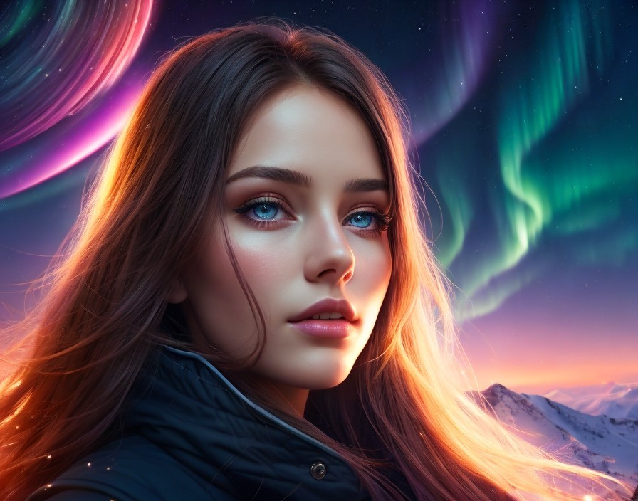 Prompt: "A young woman with beautiful eyes and great hair. It's winiding. In the background you can see a staircase. Night, stars, northern lights, shooting stars"