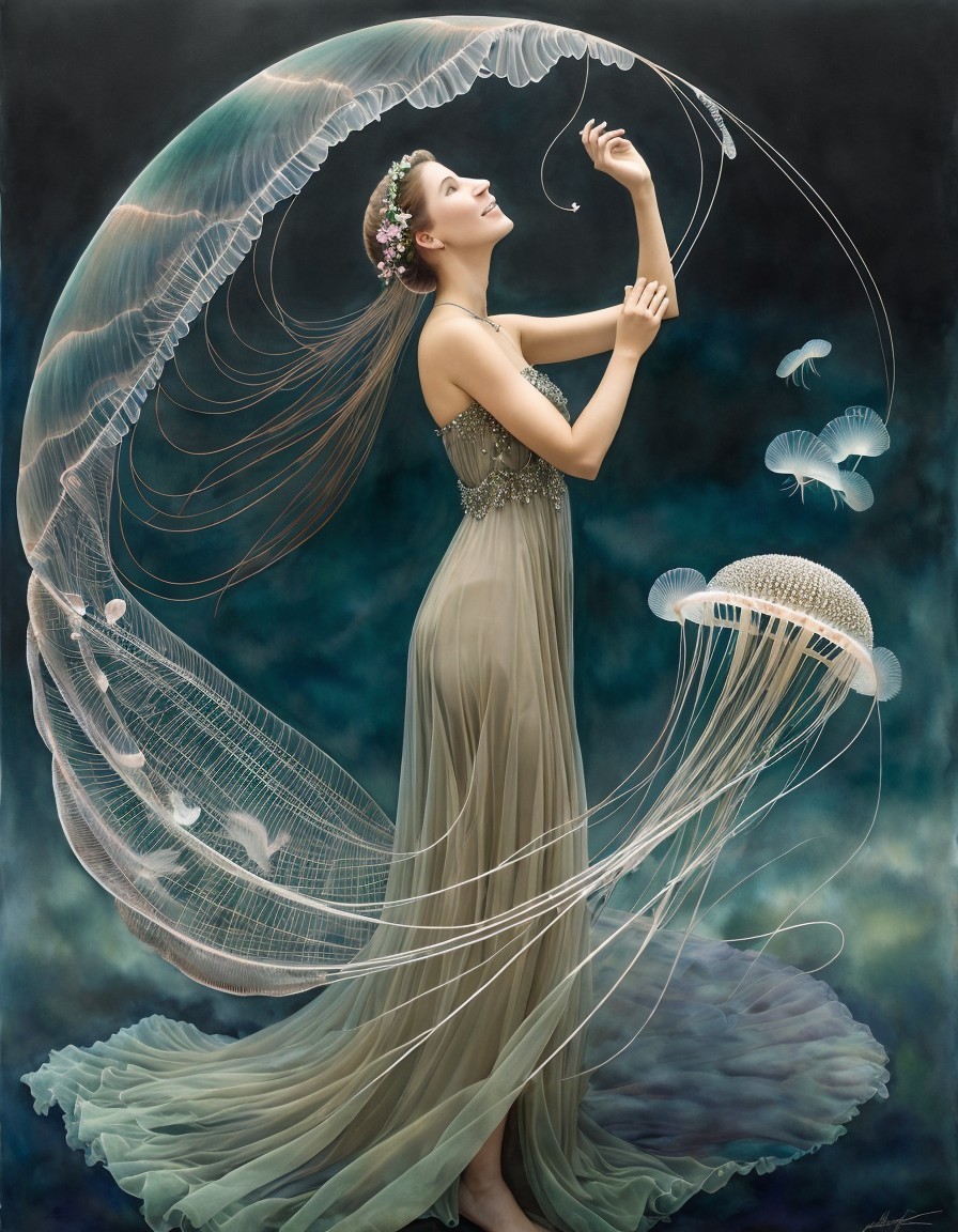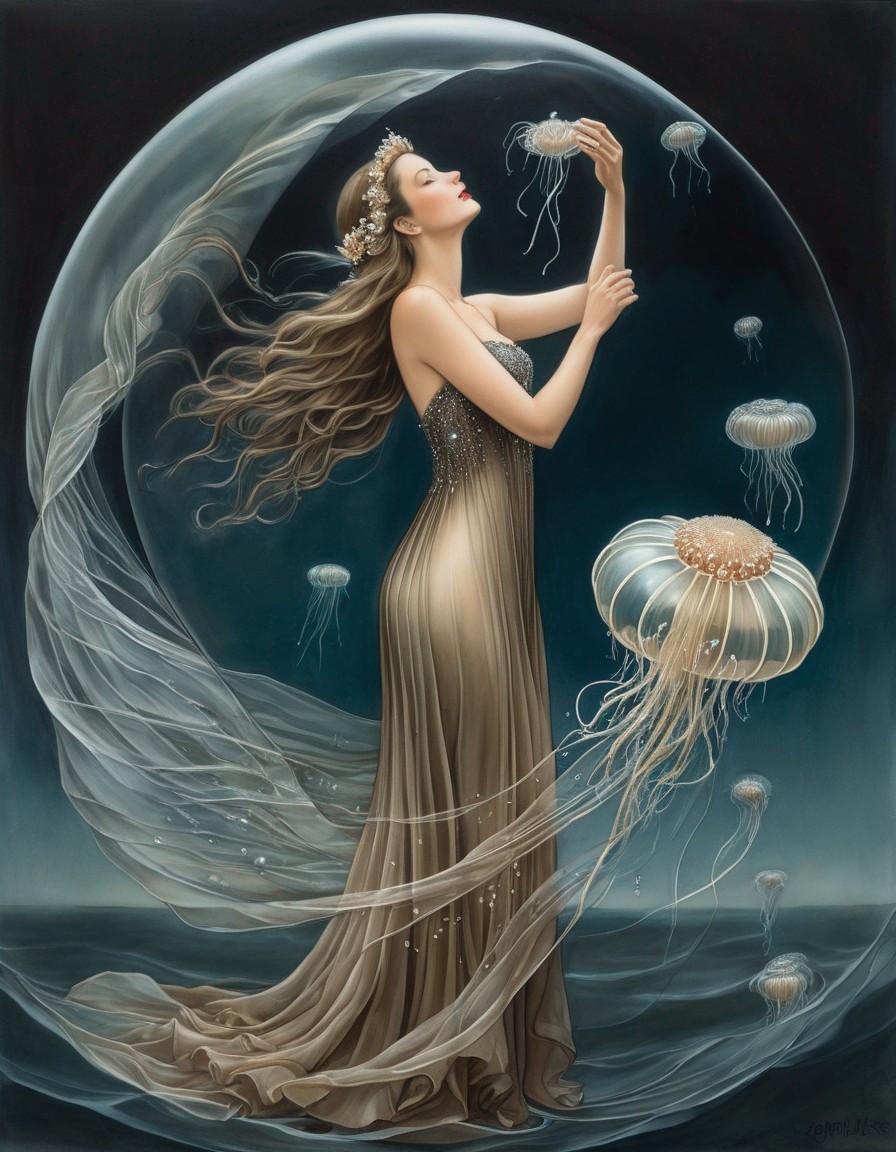 A woman in a flowing gown holds a bubble with a jellyfish; more jellyfish float in a larger bubble against a moonlit seascape.